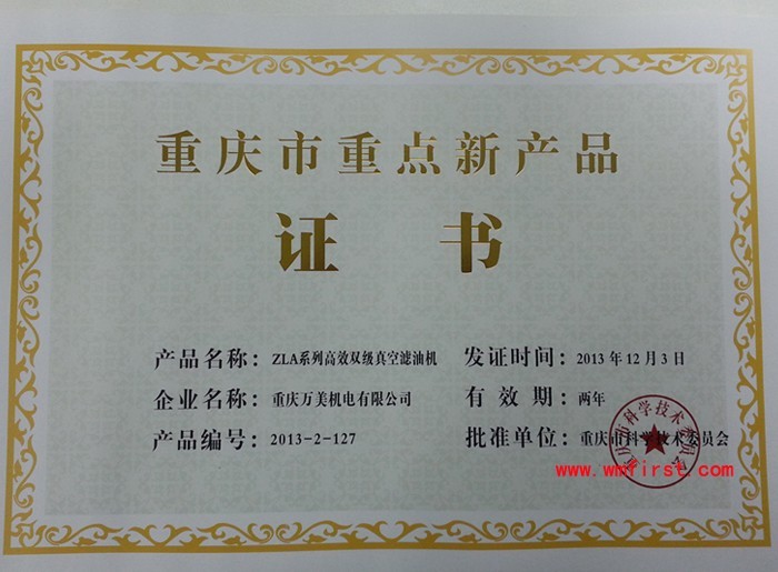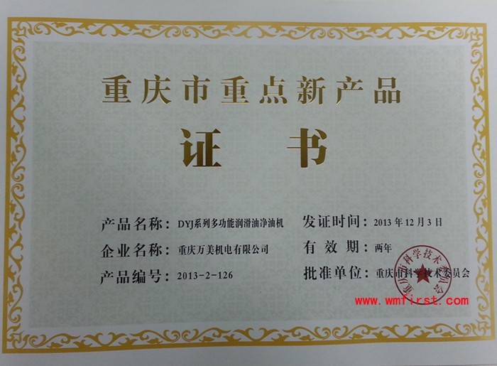 熱烈祝賀,我公司的“DYJ系列多功能潤滑油凈油機(jī)”、“ZLA系列高效雙級真空濾油機(jī)”經(jīng)重慶市科學(xué)技術(shù)委員會相關(guān)專家的鑒定,榮獲重慶市科學(xué)技術(shù)委員會頒發(fā)的重慶市重點(diǎn)新產(chǎn)品證書。而在此之前,我公司的這兩個系列的凈油機(jī)(濾油機(jī))就已是專利及高新技術(shù)產(chǎn)品。此外,我公司還有多款濾油機(jī)擁有專利和高新技術(shù)產(chǎn)品稱號。